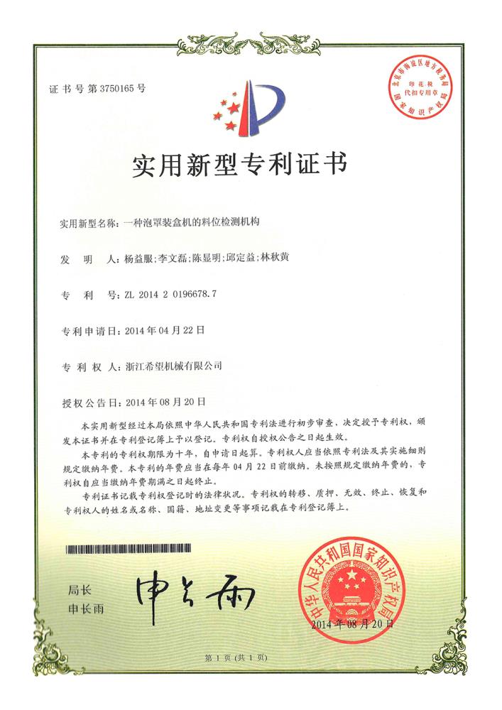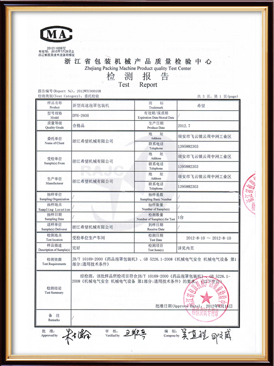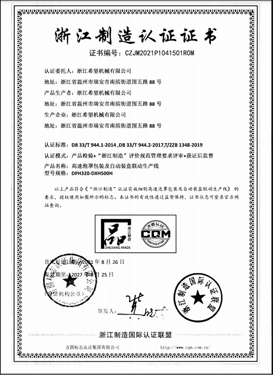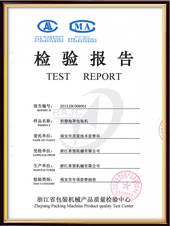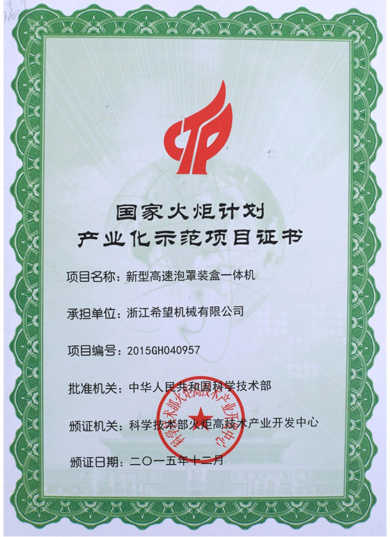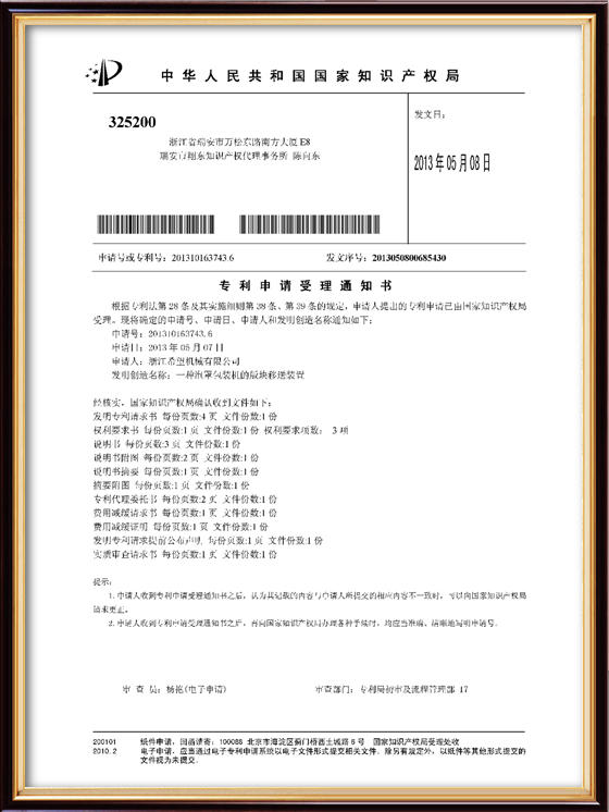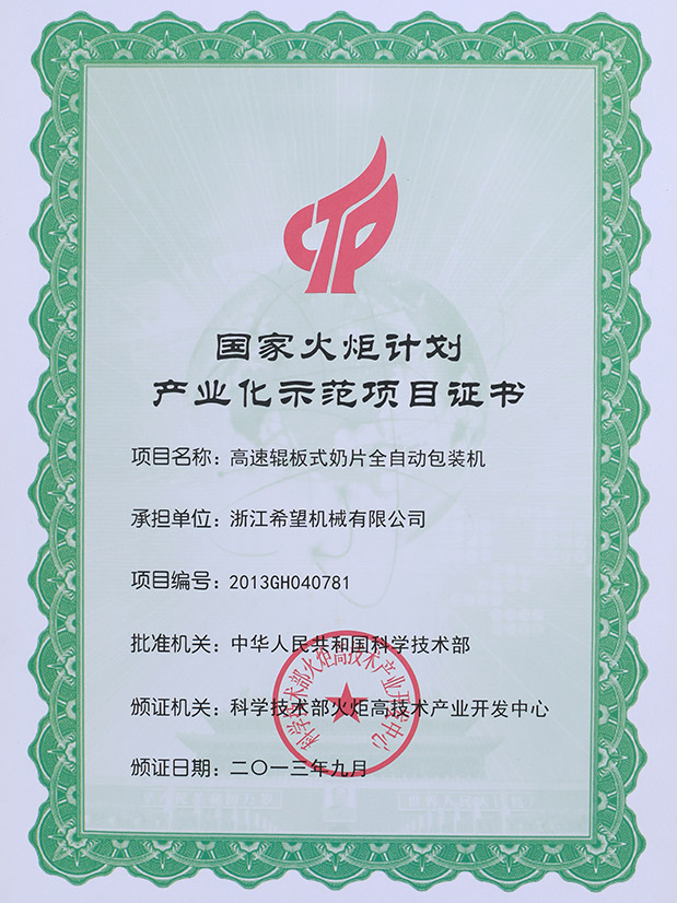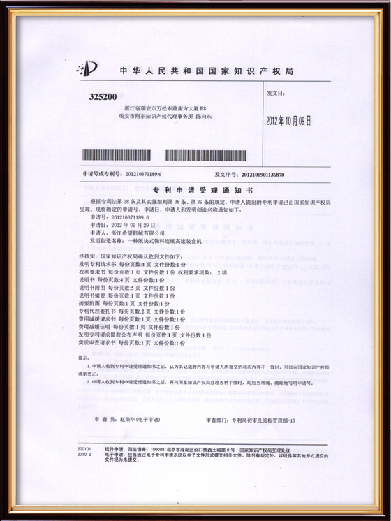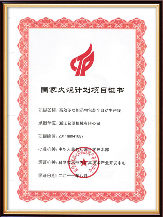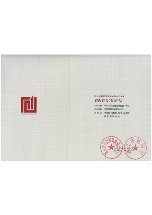 2016年“DHL600高速泡罩装盒一体机”获浙江省首台套产品荣誉称号。